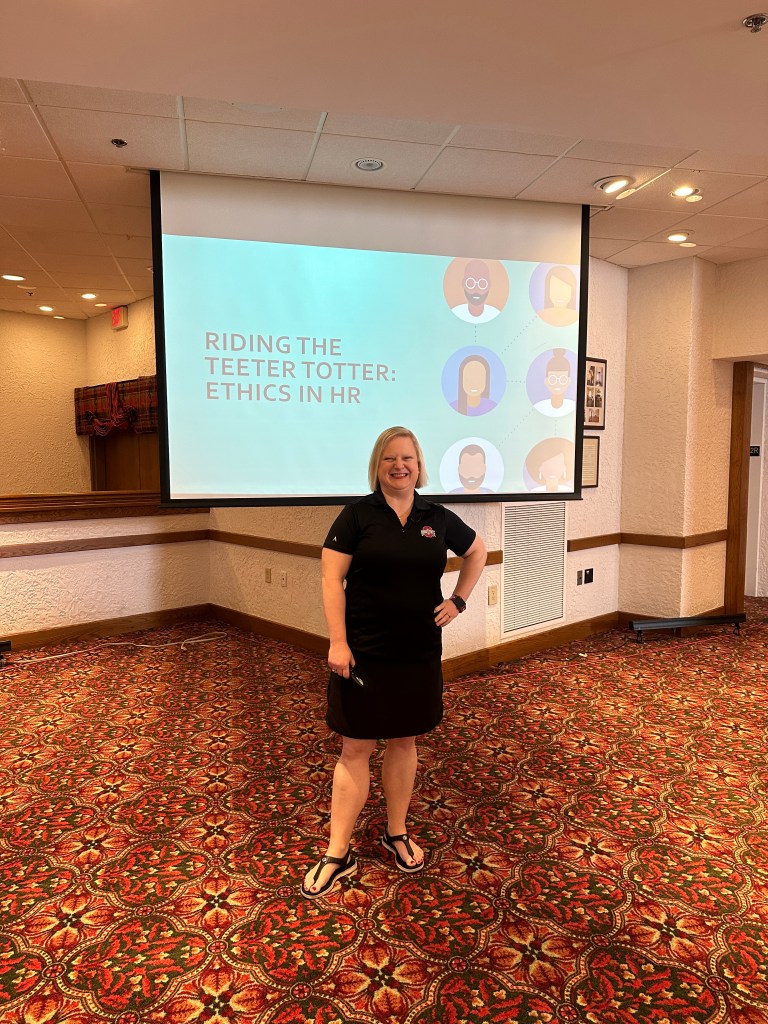 - Christie Engler did an amazing session on workplace ethics. We all as individuals have our own levels of morals and ethics of where lines are crossed. She went through various workplace situations that she has experienced with her clients and had us all discuss as HR pros how we would handle it. One of my biggest take-a-ways was to handle situations as they arise. Don’t proactively send out policies. Carrot vs. the stick concept. Focus on improving culture and positive change vs. monitoring and putting more punitive outcomes in place proactively that may not be needed. How leaders communicate/roll out a change makes all the difference because it impacts retention and engagement. And what is the intention behind the change? You could be negatively or unnecessarily impacting retention and engagement by putting a monitoring policy in place for example when it’s not needed. As HR, we need to tell the manager/owner etc what will happen if they decide to do XYZ, it’s up to them what happens next. We are advisors.