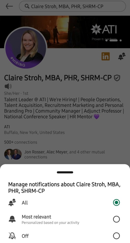 Connecting and commenting intentionally is just as important. I encourage you for every 1 post you share – find 3-5 new people to send thoughtful connection request notes to on LinkedIn. If you are active in a job search, I highly recommend getting LinkedIn Premium so you can send a connection request note with every single connection request, tailored to that person. You will also have 300 characters for your connection requests with Premium rather than 200. This was something else I saw when speaking to my connections – they were sharing post after post into the same void. I get it, it’s easier to throw a post out there to everyone than to do the intentional work of researching/searching for people and sending a tailored connection request note to each of them. Think about who might be the next person who’s hiring you – what types of companies or what company exactly do they work at? Are there other HR leaders (there always are!) that you can connect with, learn from and engage with their posts? (Remember when you leave a thoughtful comment on someone’s post, all of their connections can see you!) Reach out to your existing trusted network and ask if they have a recommendation for someone new you could connect with. I always have recommendations when people reach out and ask! (: